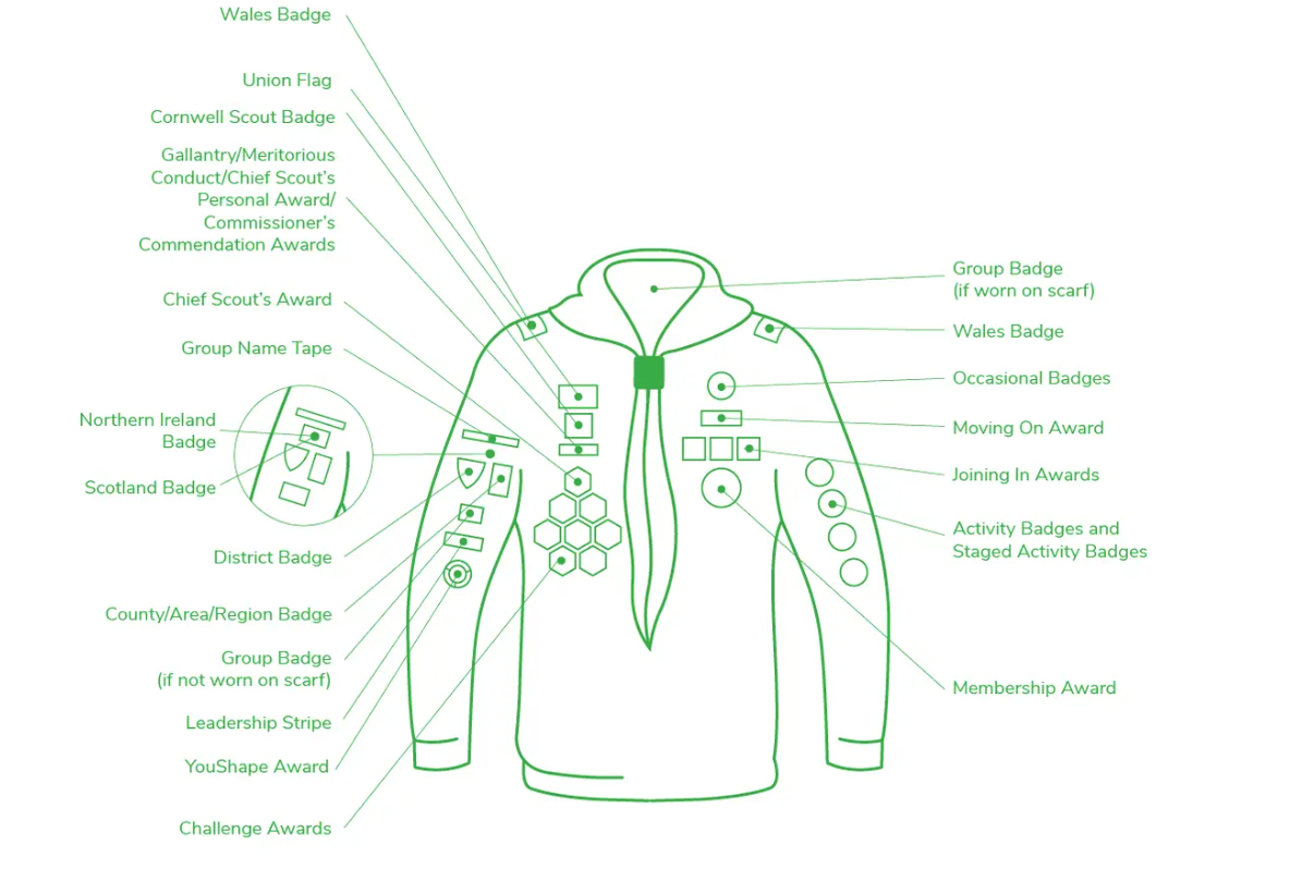 Below you will find a diagram of where to place badges on a Cub Scout Sweatshirt. For more information, please visit our blog - https://shop.scouts.org.uk/2018/06/20/badge-placement-2