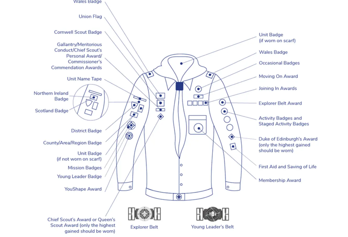 Below you will find diagrams of where to place badges on an Explorer shirt and an Air or Sea Scout Explorer shirt. For more information, please visit our blog - https://shop.scouts.org.uk/2018/06/20/badge-placement-2